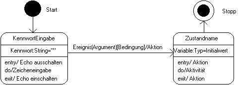 Zustandsdiagramme zeigen einfach eine Folge von Zuständen, die ein Objekt im Laufe seines Bestehens einnehmen kann. Zustandsdiagramme beschreiben endliche Automaten.