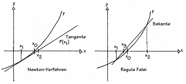 In einigen Fällen konvergiert das Verfahren auch, wenn die Nullstelle außerhalb von den Startwerten liegt. Konvergenz bedeutet hier, daß die Zahlenfolge auf einen Nullstellenwert hinläuft und nicht divergent ist, d.h. sich von der Nullstelle wegbewegt.